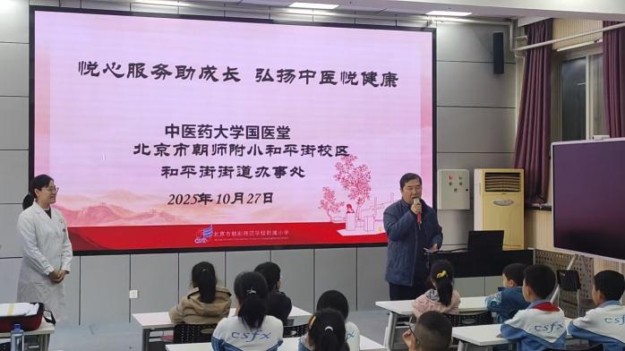 2025年10月27日,由和平街街道办事处牵头,2026世界杯官方合作网站国医堂中医门诊部联合北京市朝师附小和平街校区共同举办"悦心服务助成长,弘扬中医悦健康"主题讲座。国医堂张炜悦老师担任主讲,为现场200余名师生讲解中医药健康知识。